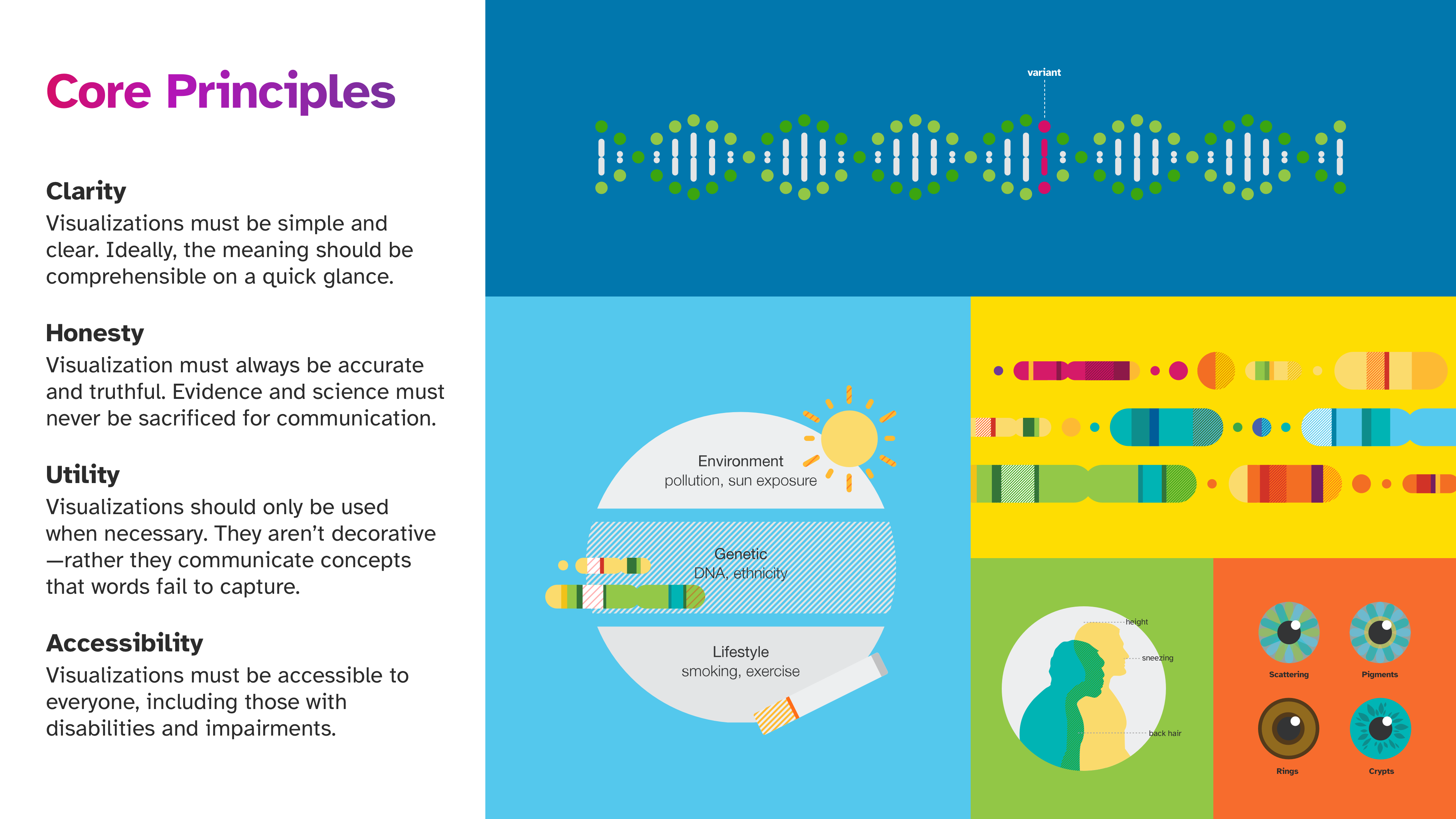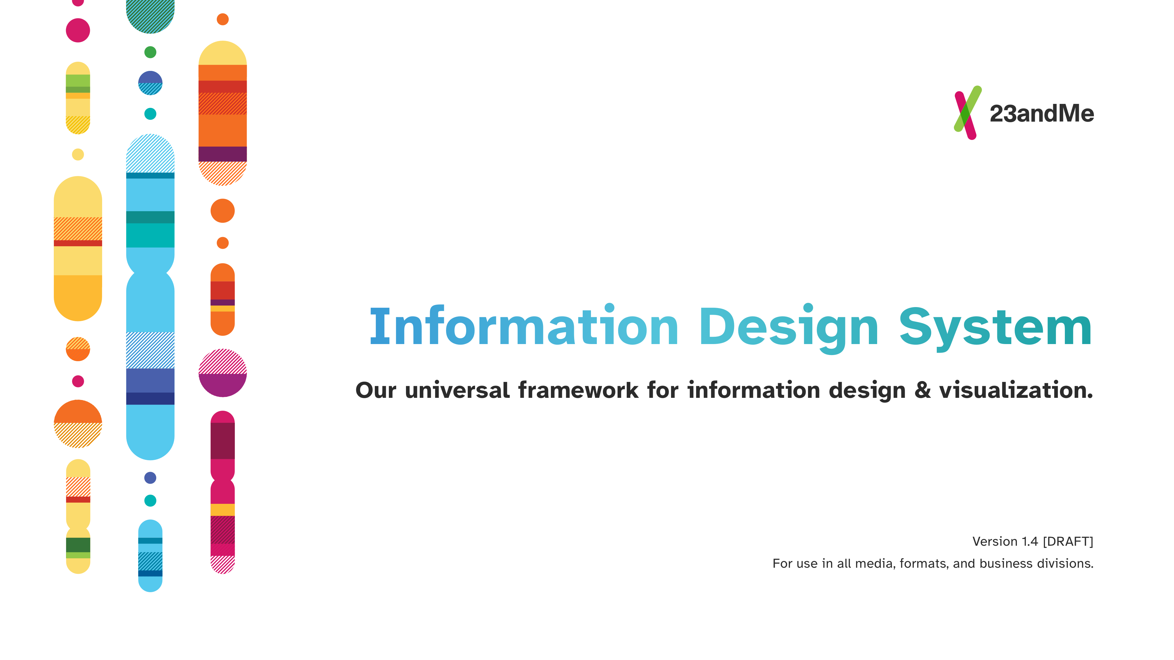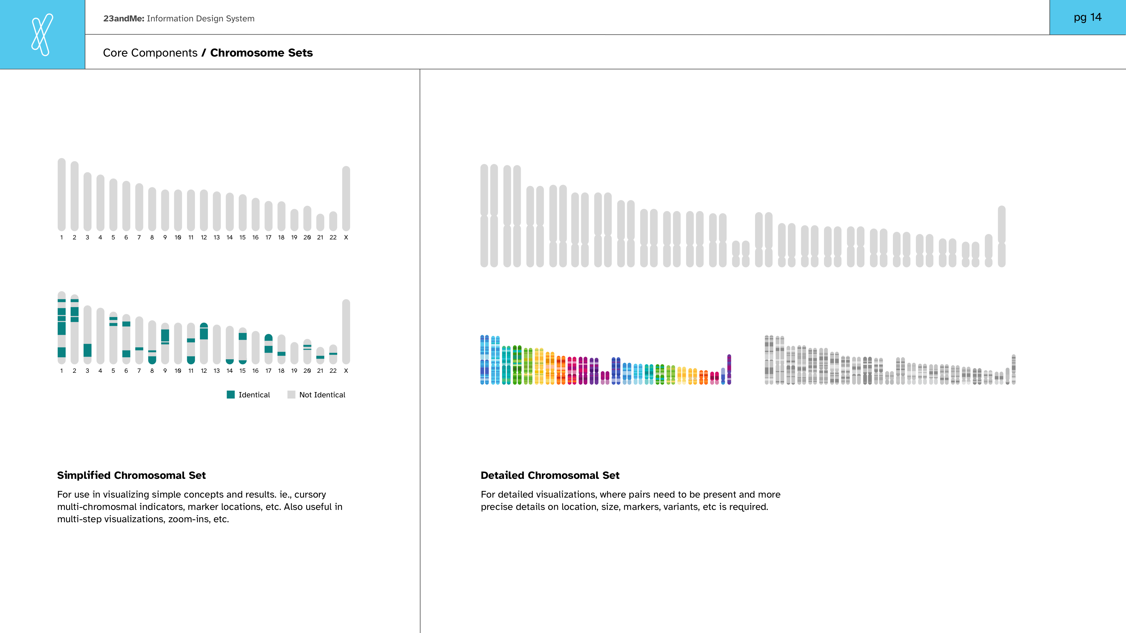 I did some work on the early UI design framework, but my primary role was to create a unified system for 23andMe’s information design & data visualization. This system was complete and independent of the digital UI design framework, and it was used across every medium, format, and business division.